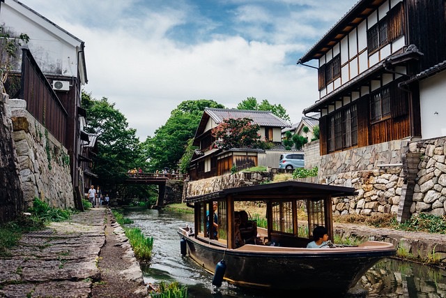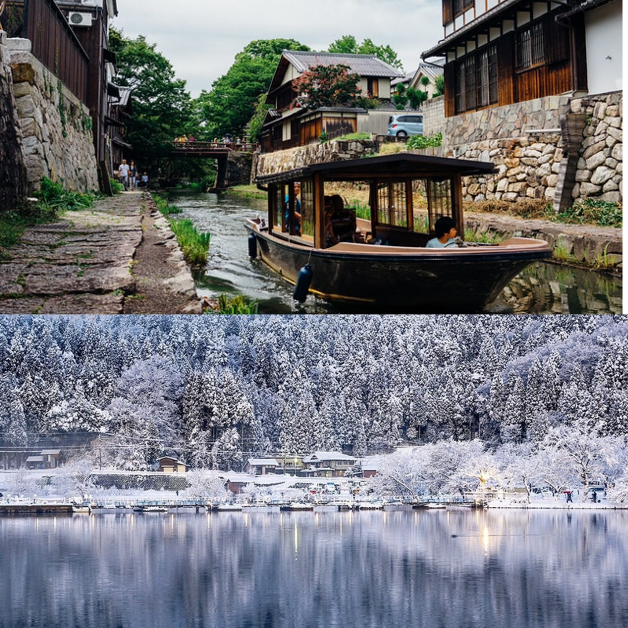 水郷の静かな水面、白壁の蔵、石畳の小道