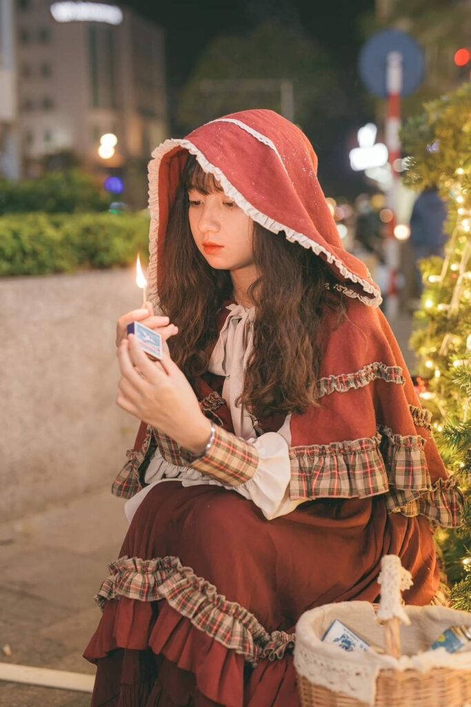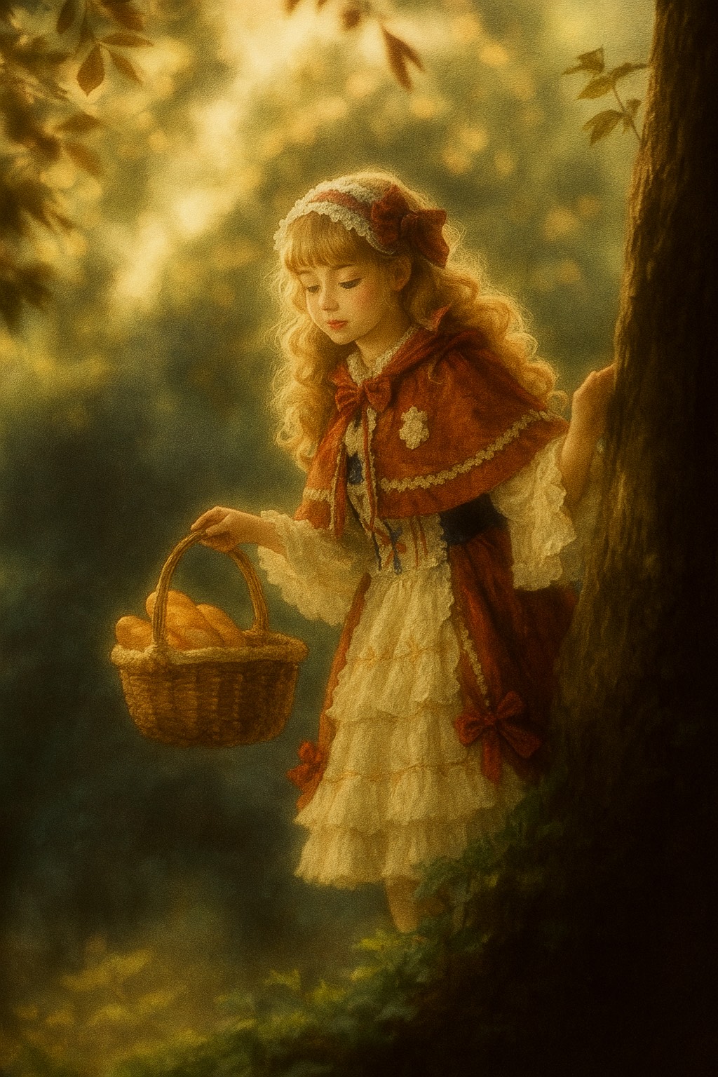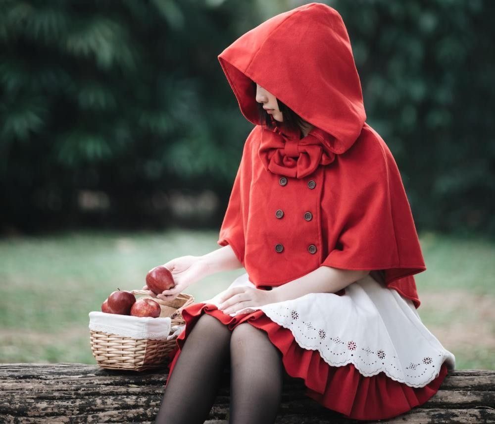 木漏れ日の中に立つ赤いフードの少女。