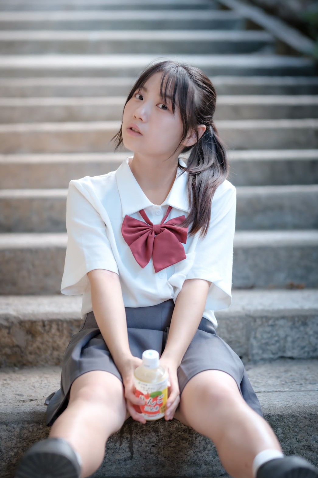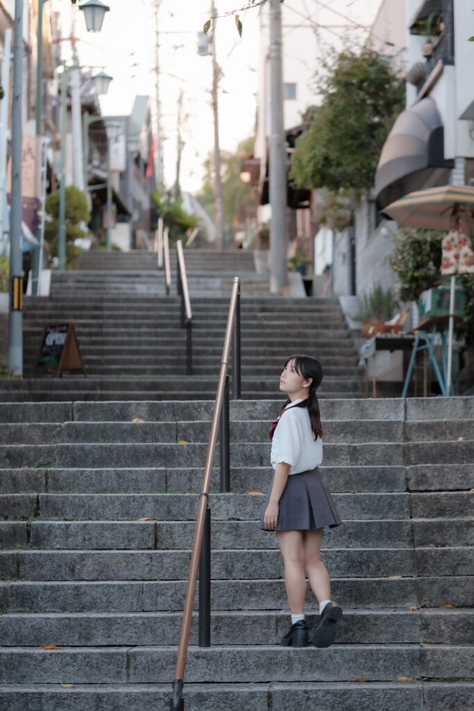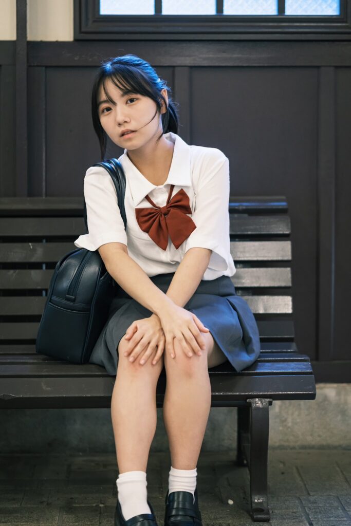 制服姿の背中に、秋の光がやさしく差し込む…静かな青春ロケ。