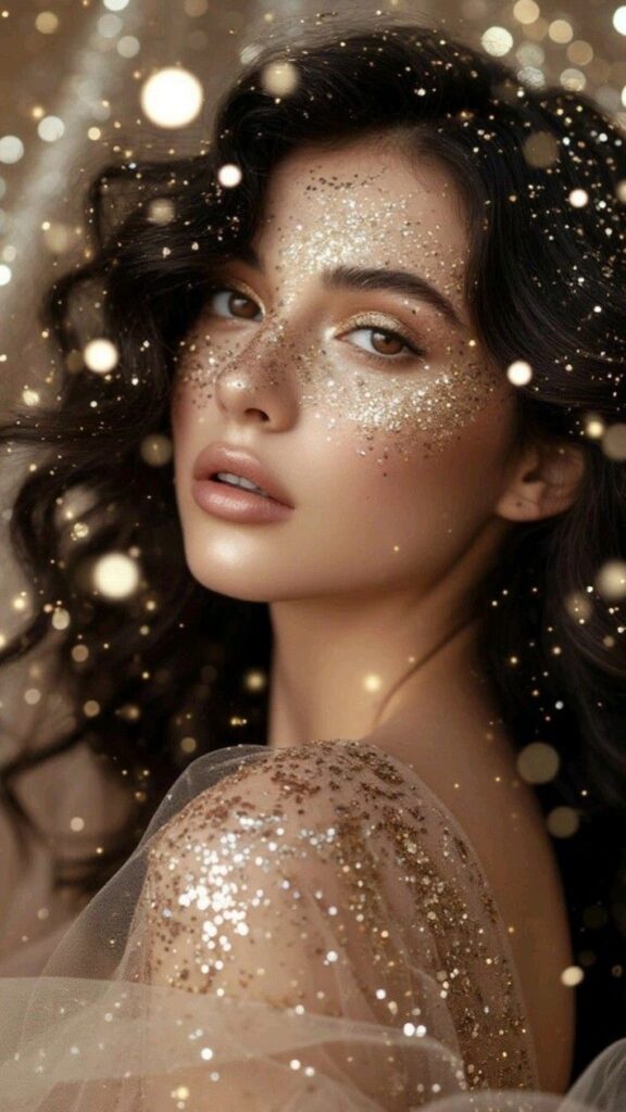 肌に浮かぶ金箔の質感、ドレスの陰影、そしてスタジオに差し込む光が混ざり合う瞬間を