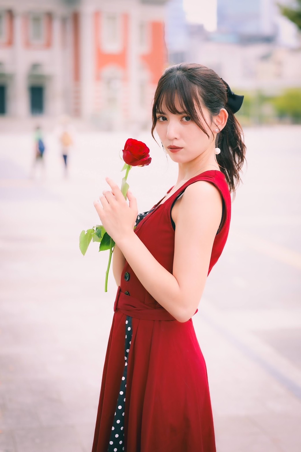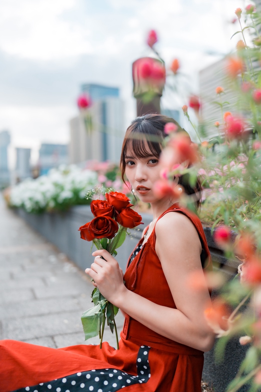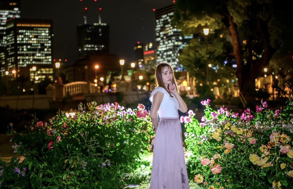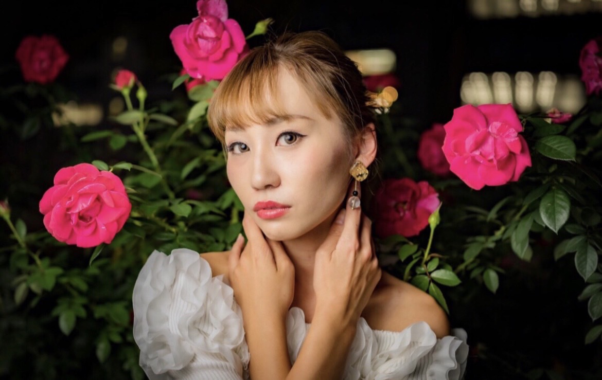 手元に咲くバラを主役に、顔にやさしく当たる光だけで仕上げるドラマチックなポートレート。