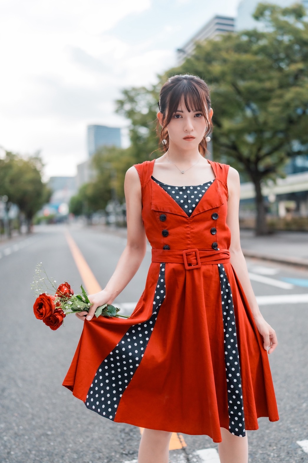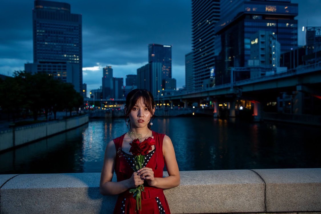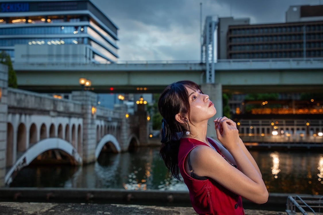 落ち着いた街の明かりと水辺の広がりがあるから、モデルが自然に引き立ち、